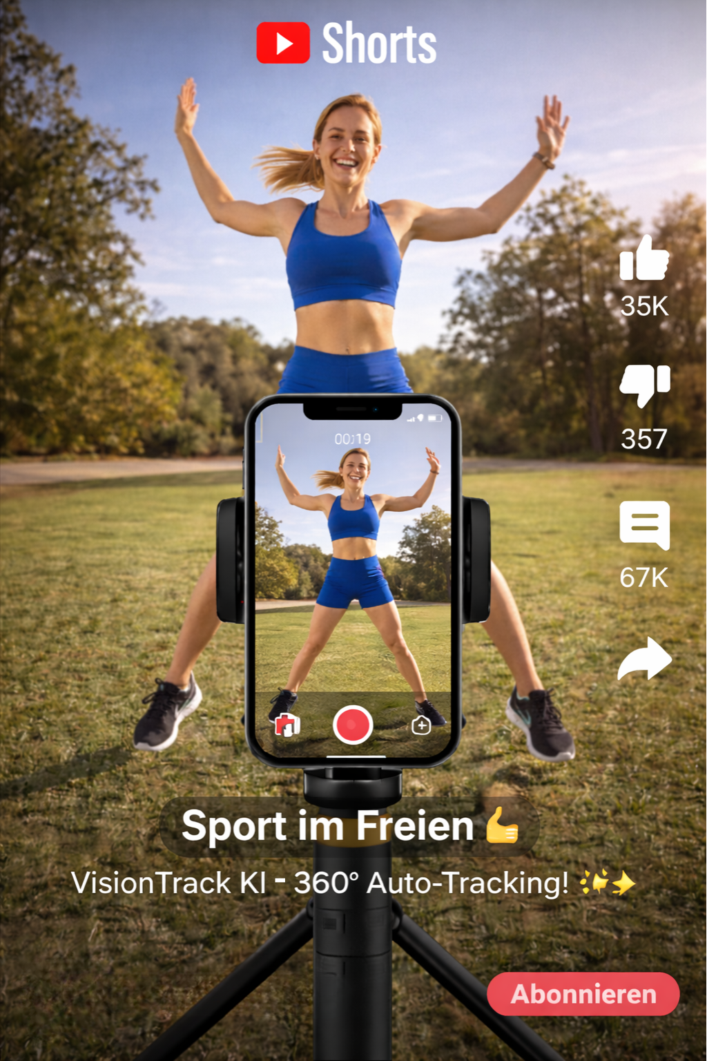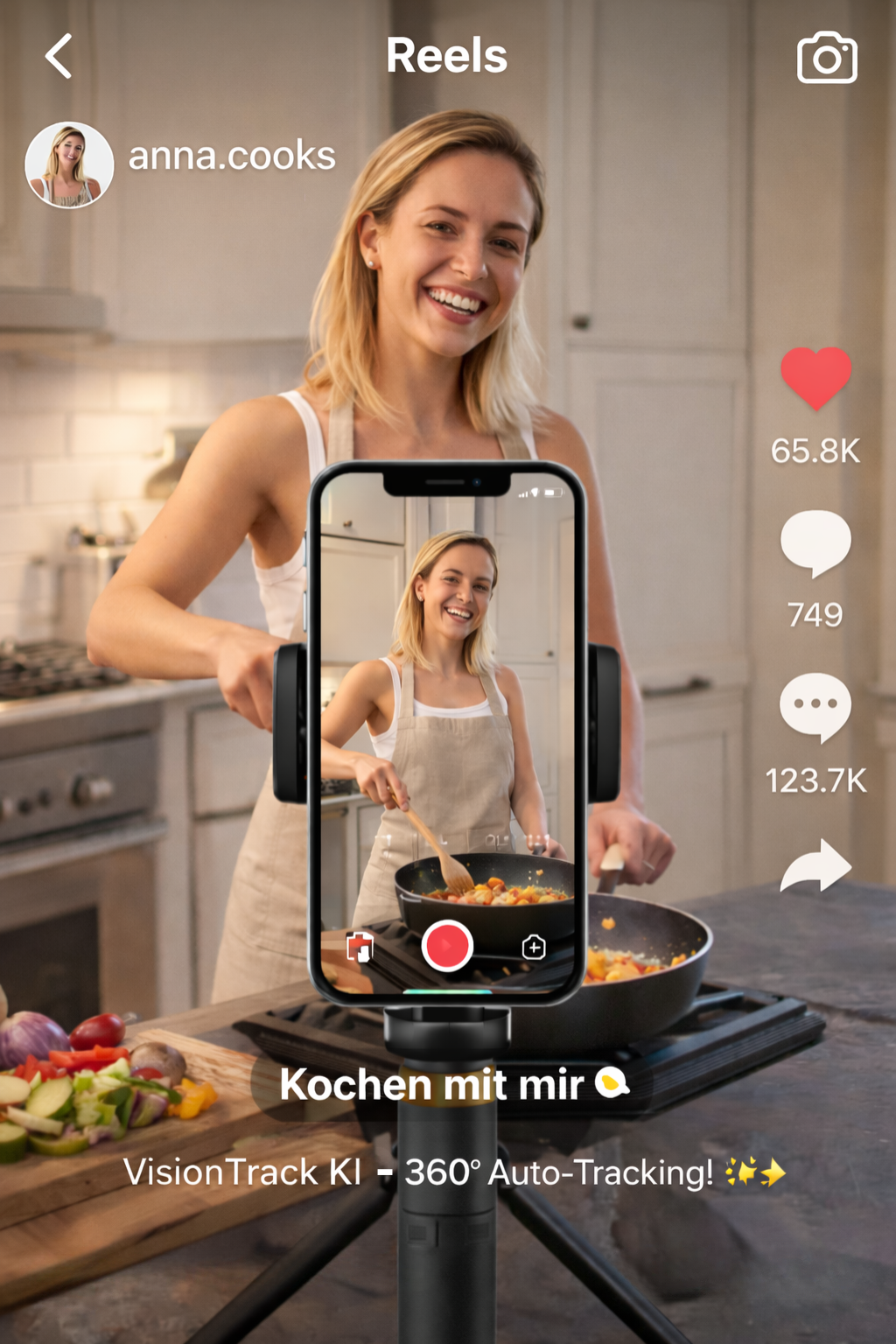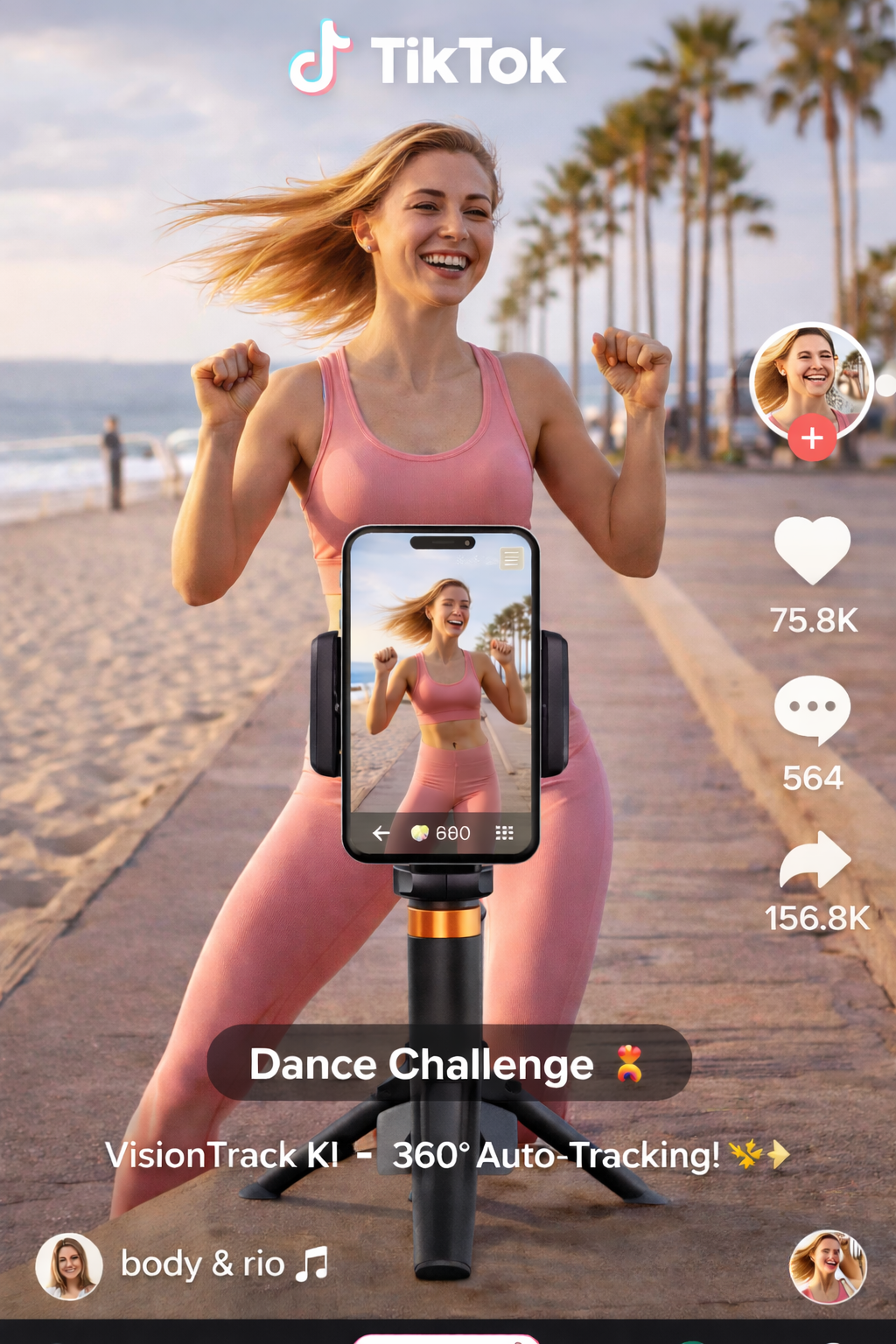 VisionTrack ist mit allen gängigen Smartphones kompatibel und dank 360° Tracking und stabilem Stativ ideal für professionelle Aufnahmen – jederzeit und überall.